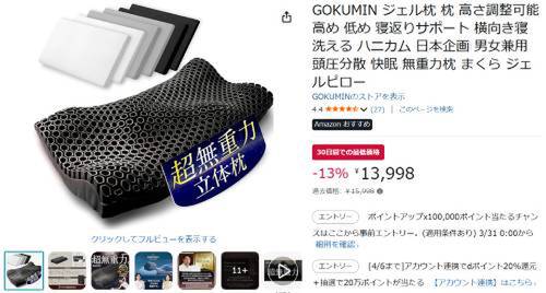 「GOKUMIN ジェル枕」がAmazonで割引対象。過去価格15,998円のところ、13%オフの13,998円で販売中。