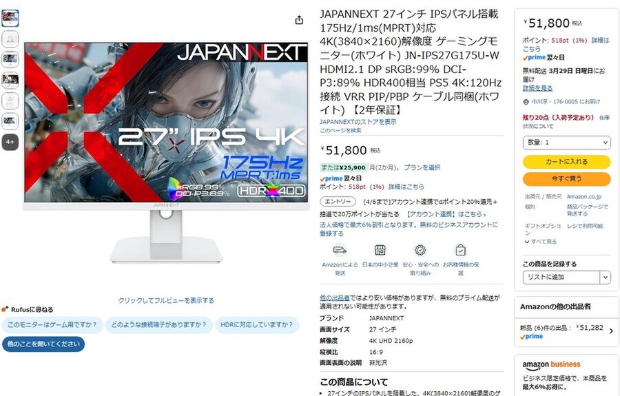 Amazon.co.jpにて、JAPANNEXTの27型4K/175Hzゲーミングディスプレー「JN-IPS27G175U-W」が販売中だ。価格は5万1800円。