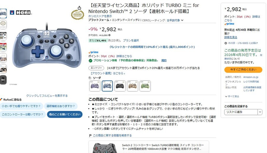 Amazon.co.jpにて、「【任天堂ライセンス商品】ホリパッド TURBO ミニ for Nintendo Switch 2 ソーダ【連射ホールド搭載】」が販売中だ。参考価格は3280円だが、執筆時点では9%オフの2982円で購入できる(3月27日時点)。