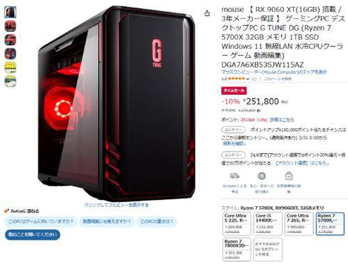 マウスコンピューターのゲーミングデスクトップPC「G TUNE DG」がAmazonタイムセール対象。参考価格279,800円のところ、10%オフの251,800円で販売中。