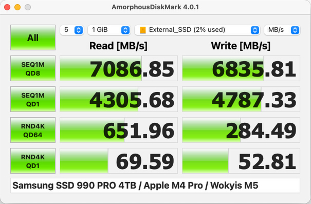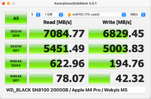 APFSフォーマットしているPCIe4.0×4対応のSamsung「990 PRO 4TB」のほか、最新PCIe5.0×4に対応するSamsung「9100 PRO 2TB」、Sandisk「WD_BLACK SN8100 2TB」を取り付け。「AmorphousDiskMark 4.0.1」を使い計測した結果が以下だ。