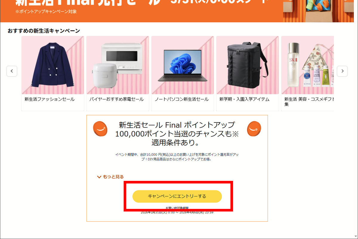 これは、エントリー期間中(3月17日12時~4月6日23時59分)にキャンペーンページからエントリーしたうえで、Amazon新生活セールFinal期間中に合計1万円(税込)以上の商品を購入すると、さまざまな条件達成に応じて追加のAmazonポイントが付与されるというもの(詳細はポイントアップキャンペーン参照のこと)。