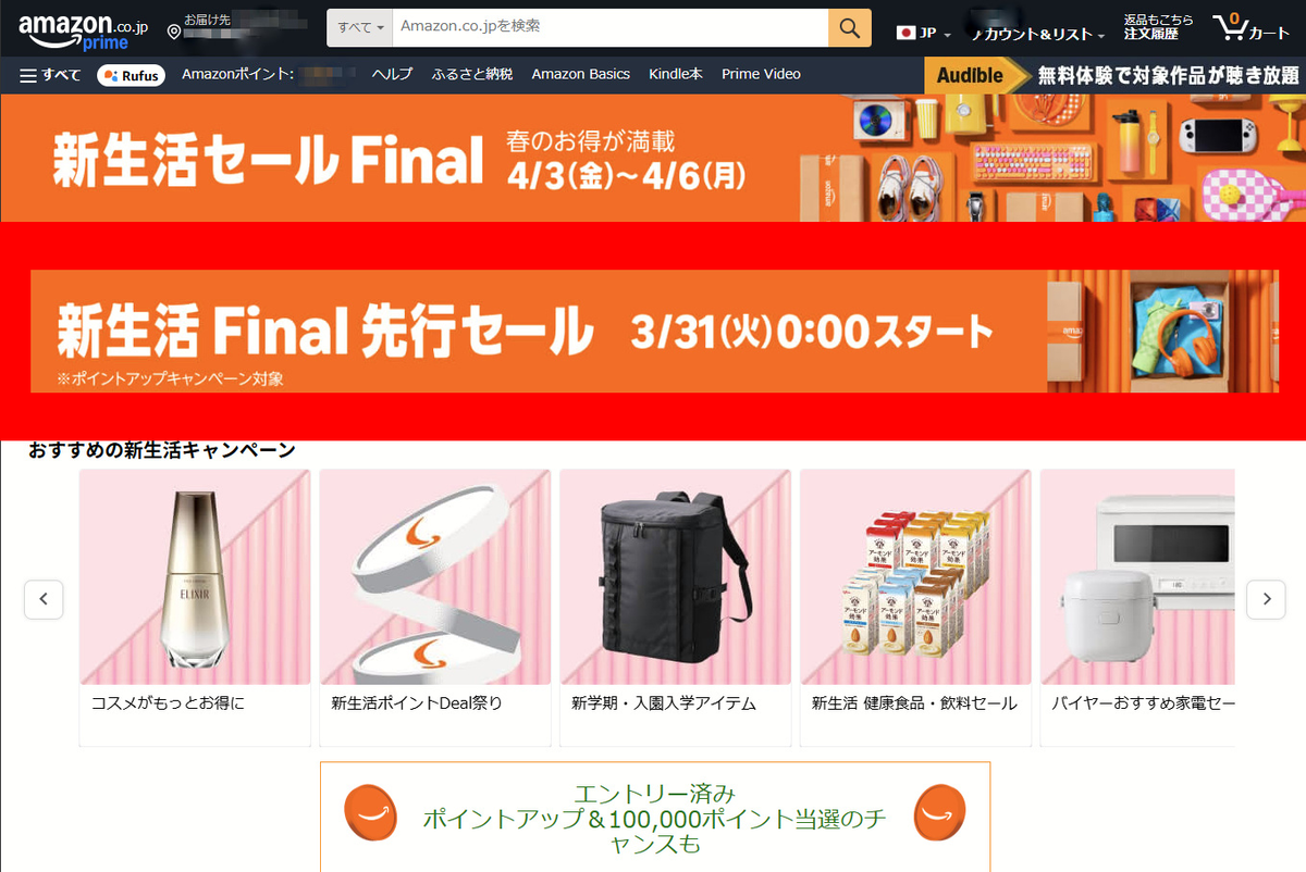 Amazon新生活セールFinalは商品の値下げだけではありません。購入時に付与されるAmazonポイントがアップするキャンペーンも併催されます。