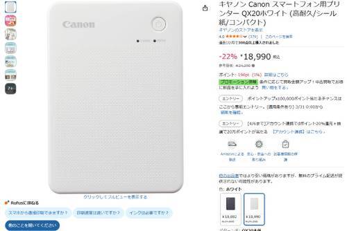 キヤノンのスマートフォン用プリンター「SELPHY QX20」がAmazonで割引対象。参考価格24,290円のところ、22%オフの18,990円で販売中。