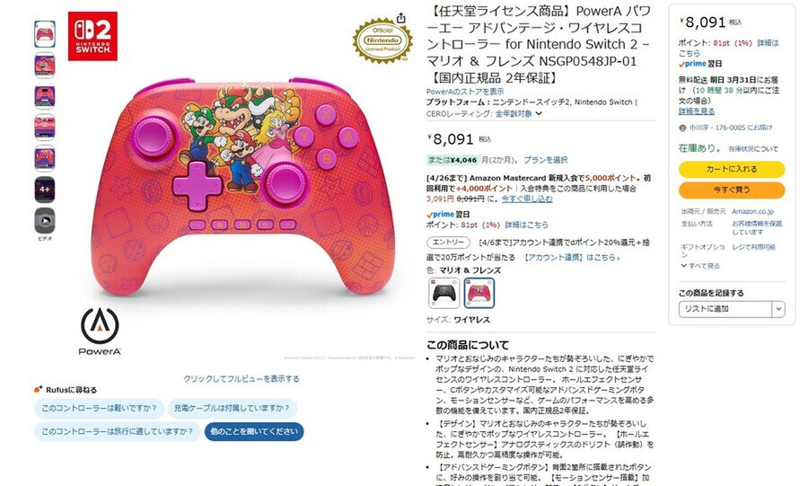 Amazon.co.jpにて、PowerAのNintendo Switch 2コントローラー「パワーエー アドバンテージ・ワイヤレスコントローラー for Nintendo Switch 2 – マリオ & フレンズ」が販売中だ。価格は8091円。
