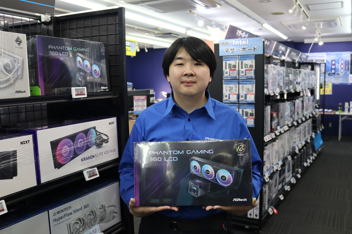 大阪・日本橋のPCパーツショップ「ドスパラ大阪・なんば店」を取材しました。店舗スタッフ・前川莉央さんのオススメは、ASRockの簡易水冷CPUクーラー「Phantom Gaming 360 LCD」です。ASRockが初参入した簡易水冷CPUクーラーのラインアップにおける、注目の1モデルとなります。