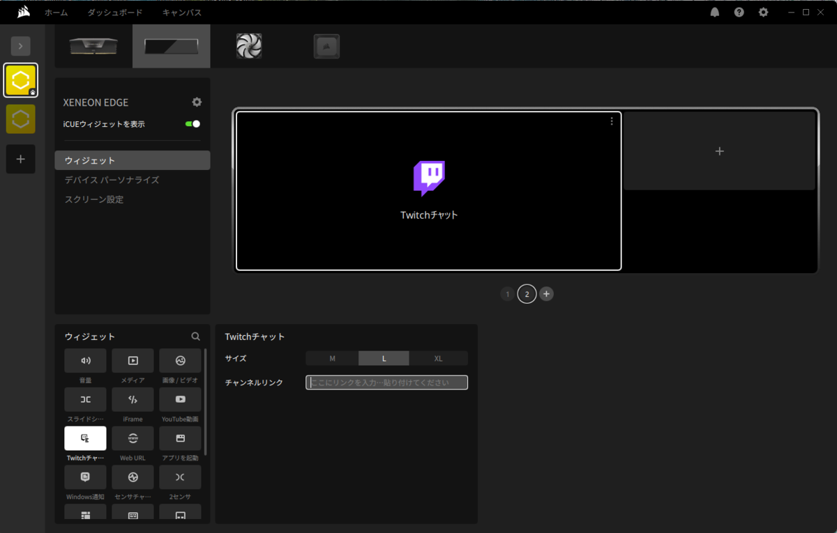 XENEON EDGEに表示する項目は、iCUE上でページを増やすことができて、かつ切り替えが可能なので、複数作っておいて気分で変えるということも可能です。
