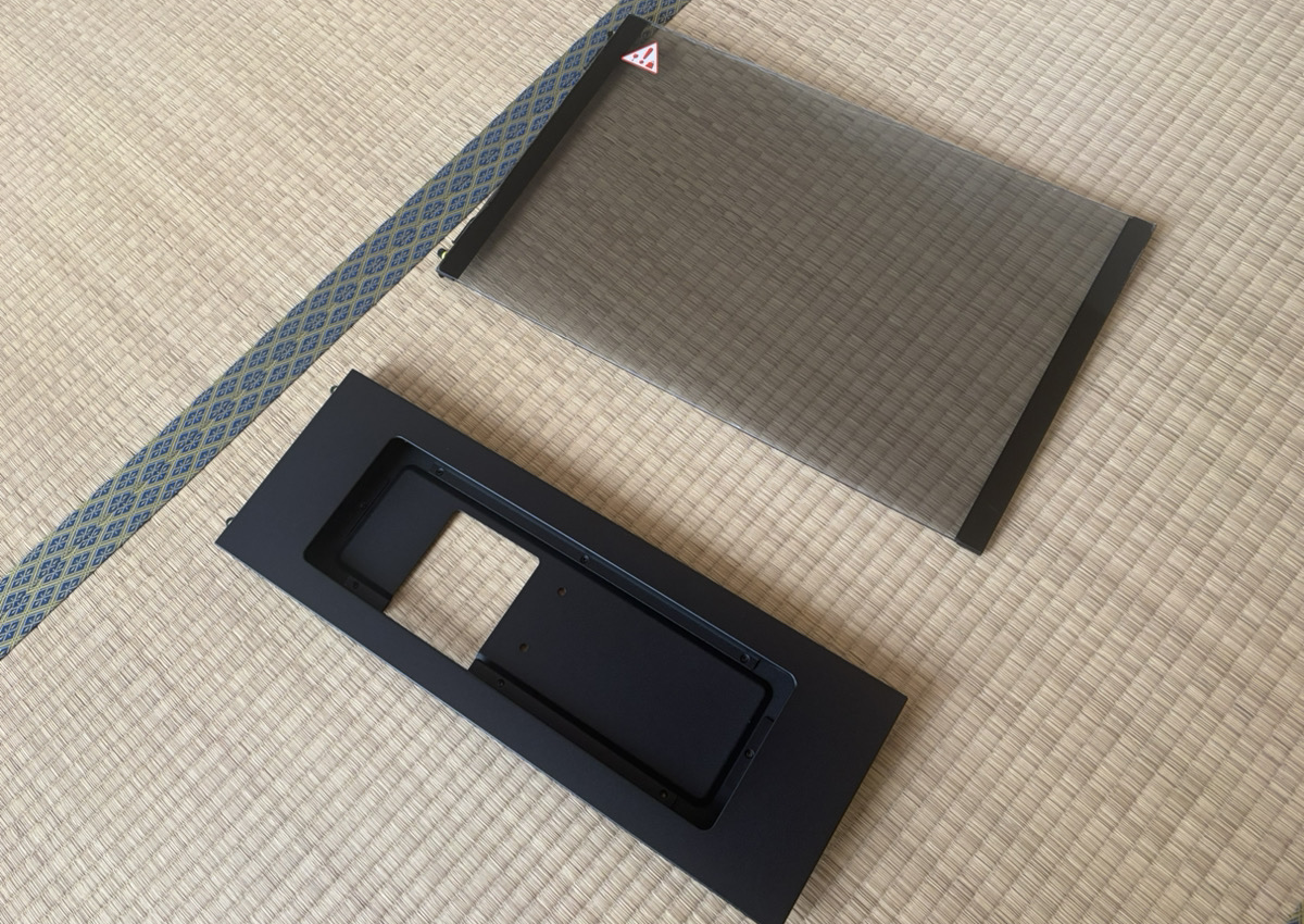 マウントキットは、サイドパネルにXENEON EDGEを組み込むためのフレームと、その上の強化ガラスパネルが同梱されていました。フレームにはXENEON EDGEがすっぽり入るサイズのくぼみがあり、ネジ穴が開いています。XENEON EDGEをはめ込んでネジで固定するだけで、簡単にサイドパネルにXENEON EDGEを装着できました。