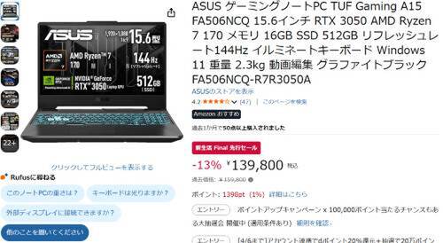 ASUSのゲーミングノートPC「TUF Gaming A15(FA506NCQ-R7R3050A)」がAmazon新生活 Final 先行セール対象。過去価格159,800円のところ、13%オフの139,800円で販売中。