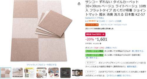 サンコーの「ずれない タイルカーペット 30×30cm(10枚入)」がAmazon新生活セール Final対象。参考価格2,002円のところ、20%オフの1,601円で販売中。