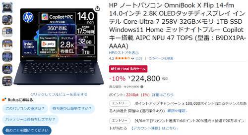 AI処理もこなすCopilot+対応、32GBメモリ × 2.8K OLEDまで積んだOmniBook X Flip 14-fmがセール