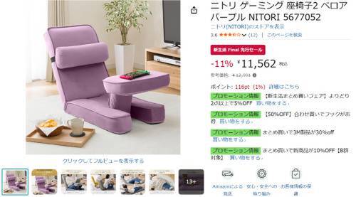 ニトリの「ゲーミング 座椅子2 ベロア パープル(NITORI 5677052)」がAmazon新生活 Final 先行セール対象。参考価格12,991円のところ、11%オフの11,562円で販売中。