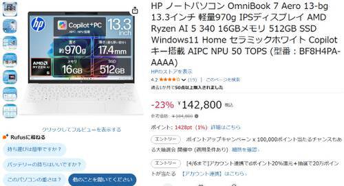 HPの13.3型ノートPC「OmniBook 7 Aero 13-bg(BF8H4PA-AAAA)」がAmazonで割引対象。参考価格184,800円のところ、23%オフの142,800円で販売中。