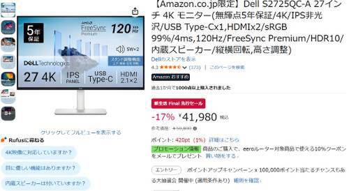 Dellの27インチ4Kモニター「S2725QC-A」がAmazon新生活 Final 先行セール対象。参考価格50,800円のところ、17%オフの41,980円で販売中。