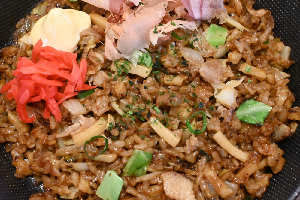 見た目は、チャーハンのよう。よくよく見ると、数センチほどに短く切られたうどんが入っています。食べる前からソースの香りが香ばしく、「よっしゃー!」とお祭りの屋台のように気分が上がります。