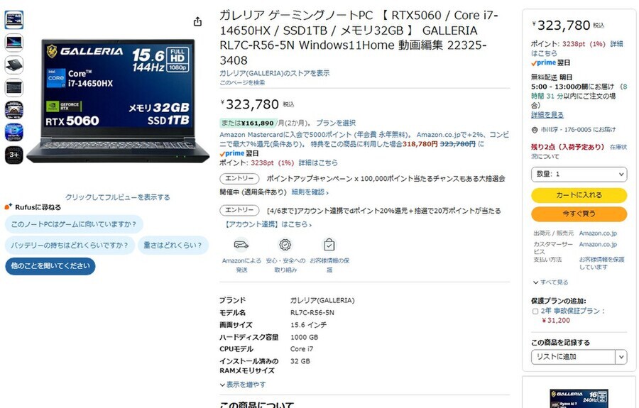 Amazon.co.jpにて、GALLERIAのゲーミングノートPC「GALLERIA RL7C-R56-5N」が販売中だ。価格は32万3780円。