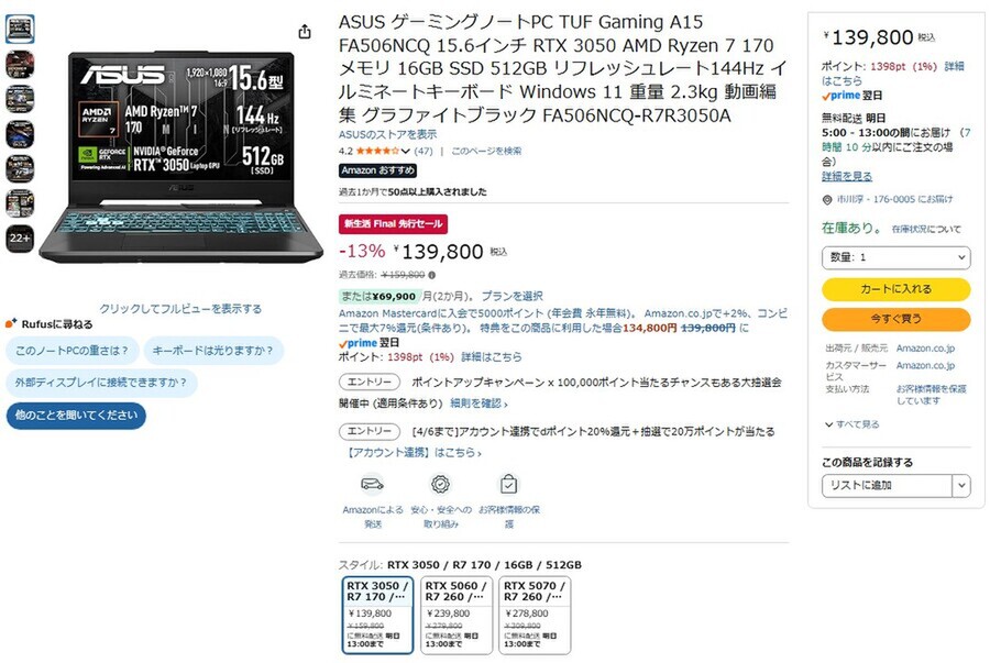 Amazon.co.jpにて、ASUSのゲーミングノートPC「TUF Gaming A15 FA506NCQ」が販売中だ。過去価格は15万9800円だが、「新生活 Final 先行セール」により13%オフの13万9800円で購入できる(4月1日時点)。