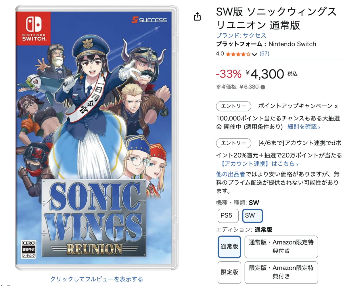 そう、「SW版 ソニックウィングス リユニオン 通常版」です。AmazonではSwitch 版が参考価格が6,380円のところ、33%オフの4,300円で購入できます(4月1日現在)。