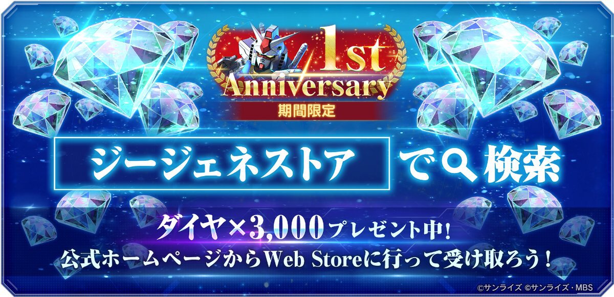 1周年を記念して、Web Storeにて期間限定で3000個のダイヤをプレゼント中。Web Store対応記念ダイヤ3000個を無料で購入できるキャンペーンも引き続き開催している。まだの人は、アプリとの連携のうえ受け取ろう。