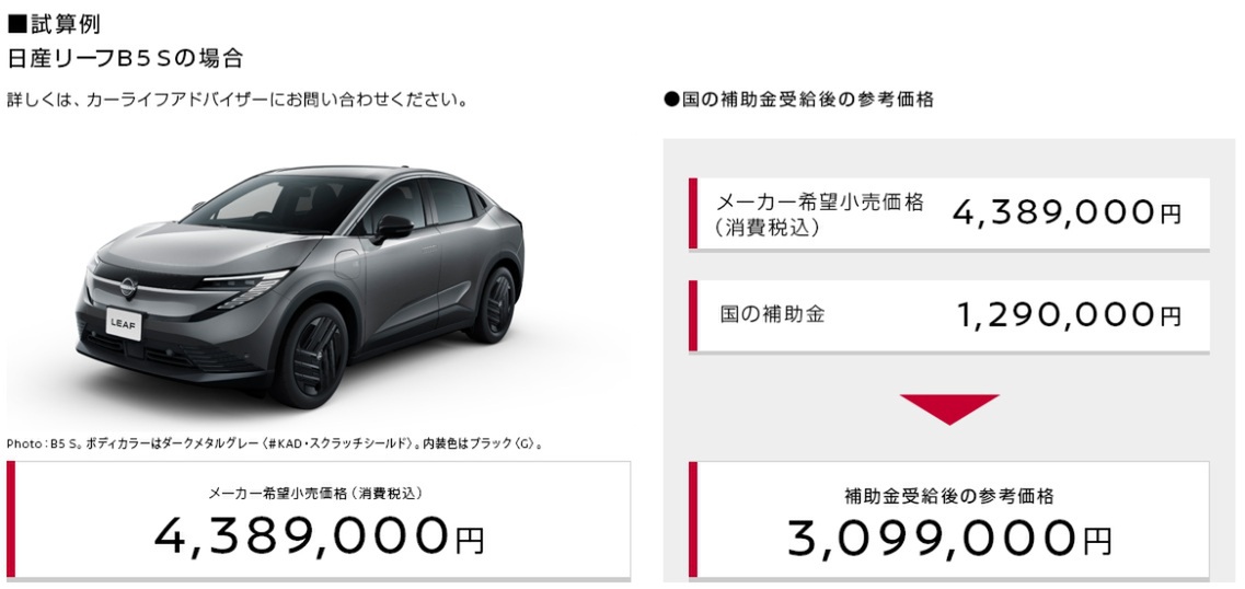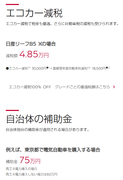 EVはガソリン車より車両価格が少し高く感じるかもしれませんが、オトクに購入できる制度が用意されています。新型リーフの場合、国からの補助金として全グレード一律で129万円が支給されます。