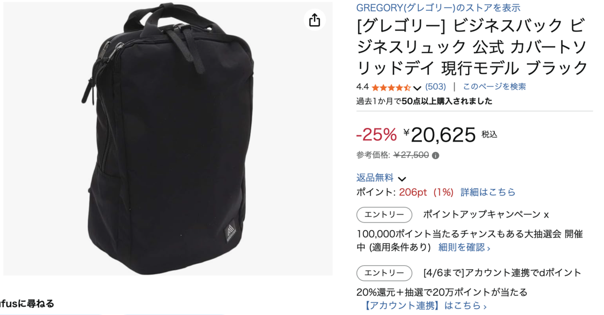 グレゴリーのカバートソリッドデイ 現行モデル ブラックが、Amazonにて25%OFFの20,625円で販売されています!