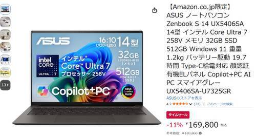 ASUSのノートPC「Zenbook S 14 UX5406SA」がAmazonタイムセール対象。参考価格189,800円のところ、11%オフの169,800円で販売中。