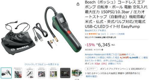 Boschの「コードレス エアポンプ EasyPump」がAmazonで割引対象。過去価格7,473円のところ、15%オフの6,345円で販売中。