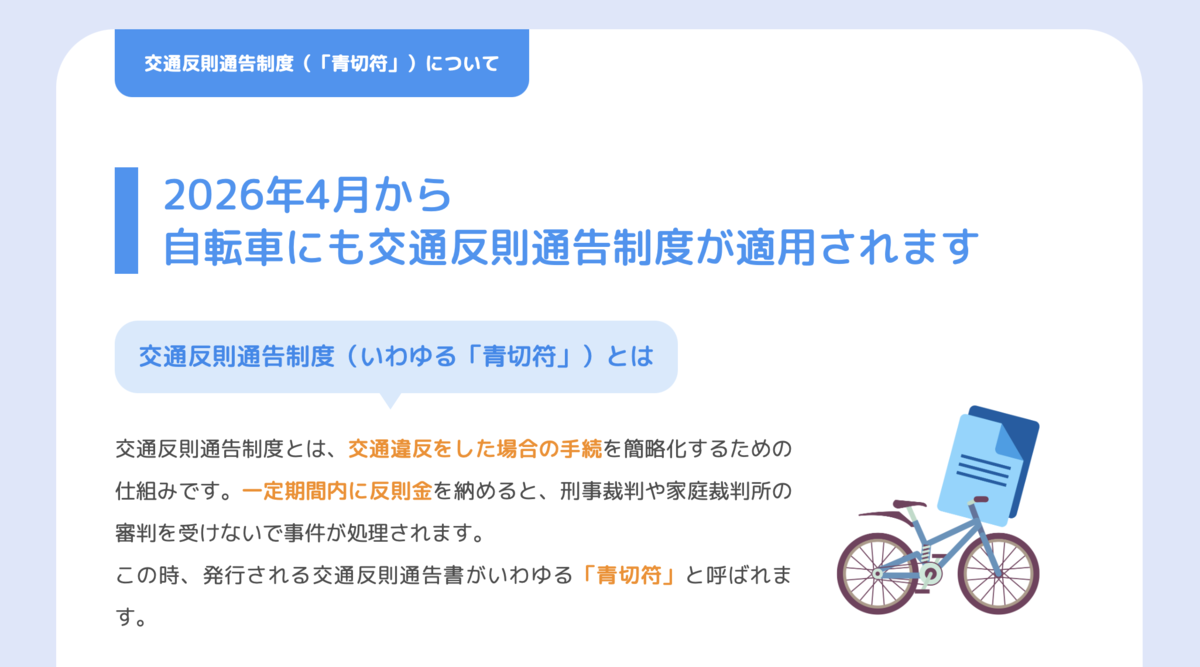 もっとも、制度の本質は処分の軽重にあるのではなく、自転車も車両である以上、ルールを守って運転する責任があるという点の再確認にある。警察庁のページが「免許はなくてもドライバー」と掲げるように(自転車の新しい制度|自転車ポータルサイト)、4月からは、自転車利用者にもより明確な責任の線引きが示されることになる。