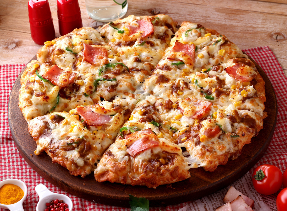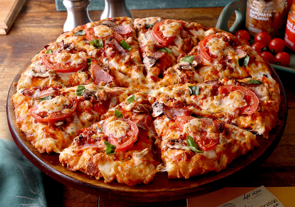 トマトやブラウンマッシュルームに加え、ハムやソーセージ、ベーコン、バジルを組み合わせた1992年発売のピザです。