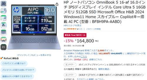 HPのノートパソコン「OmniBook 5 16-af(BF8H9PA-AABD)」がAmazon新生活セール Final対象。過去価格194,800円のところ、15%オフの164,800円で販売中。