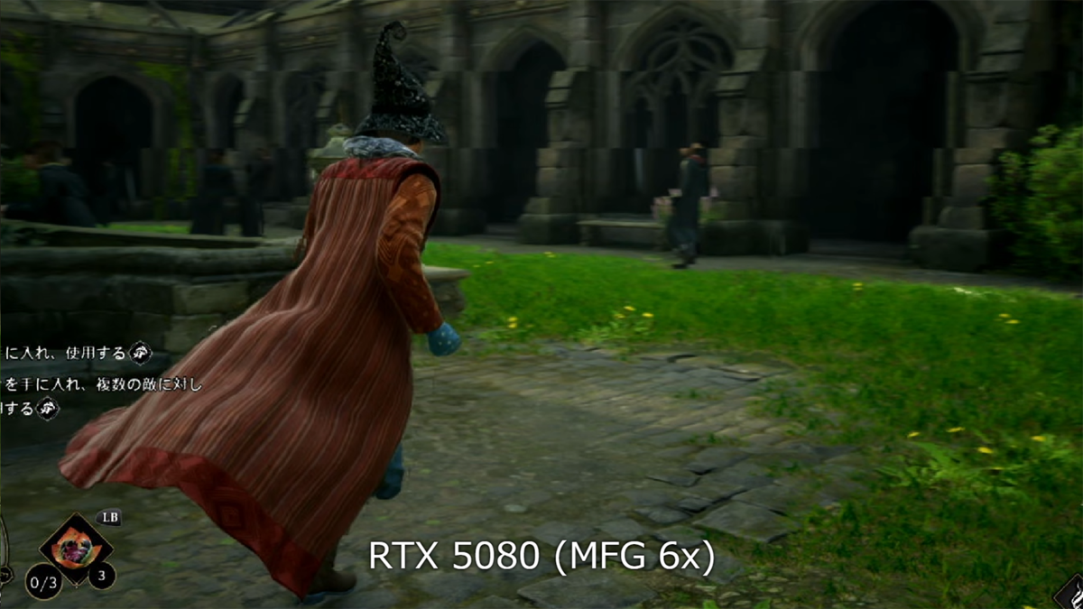RTX 5060だとDLSS-DMFGは6xに常時張り付く感じ。Cyberpunk 2077ほど操作に重さ(レイテンシー)は感じないが、キャラの輪郭がにじむような描写になりやすい。この図では前後に動く腕がボケているが、そのほかに帽子の「くるん」とした部分(ここも激しく動く)もにじみやすい