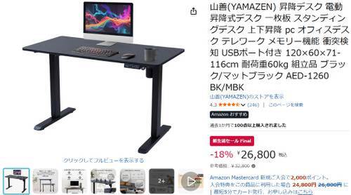 山善の「電動昇降式デスク AED-1260」がAmazon新生活セール Final対象。参考価格32,800円のところ、18%オフの26,800円で販売中。