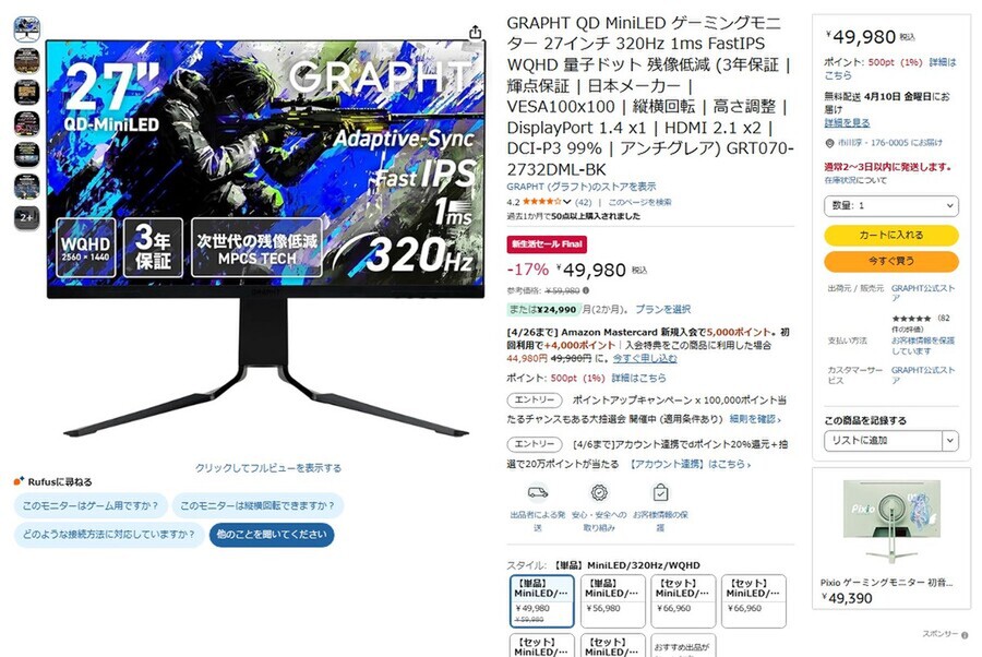 Amazon.co.jpにて、GRAPHTの27型WQHD QD-Mini LEDゲーミングディスプレー「GRT070-2732DML-BK」が販売中だ。参考価格は5万9980円だが、「新生活セール Final」により17%オフの4万9980円で購入できる(4月3日時点)。