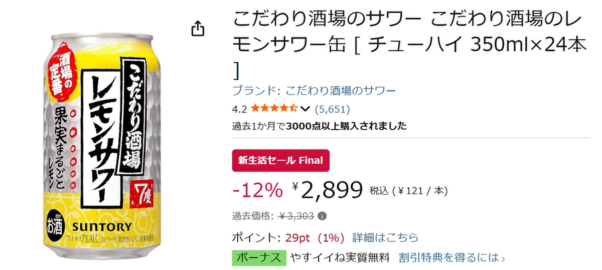 現在開催中のAmazon新生活セールFinalで、「こだわり酒場のレモンサワー缶 350ml×24本」が1本あたり約121円で購入できるチャンスとなっています。