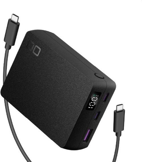 最大67W出力に対応しているので、スマホだけでなくノートPCの充電までこなせる。USB-C×2とUSB-A×1の3ポートを備え、複数の機器を同時に充電できるため、外出時の充電をこれ1台にまとめやすい。