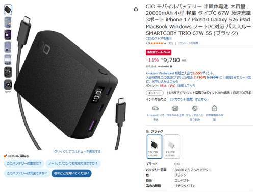 CIOの半固体電池モバイルバッテリー「SMARTCOBY TRIO 67W SS」がAmazon新生活セール Final対象。参考価格10,980円のところ、11%オフの9,780円で販売中。