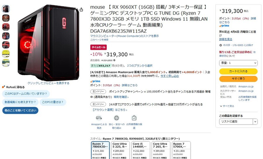 Amazon.co.jpにて、マウスコンピューターのゲーミングPC「G TUNE DG(RX 9060XT搭載)」が販売中だ。過去価格は35万4800円だが、タイムセールにより10%オフの31万9300円で購入できる(4月3日時点)。
