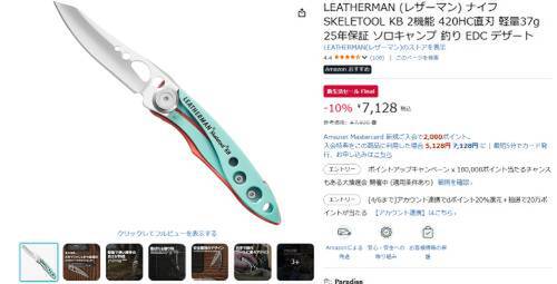 LEATHERMAN(レザーマン)の「SKELETOOL KB」がAmazon新生活セール Final対象。参考価格7,920円のところ、10%オフの7,128円で販売中。