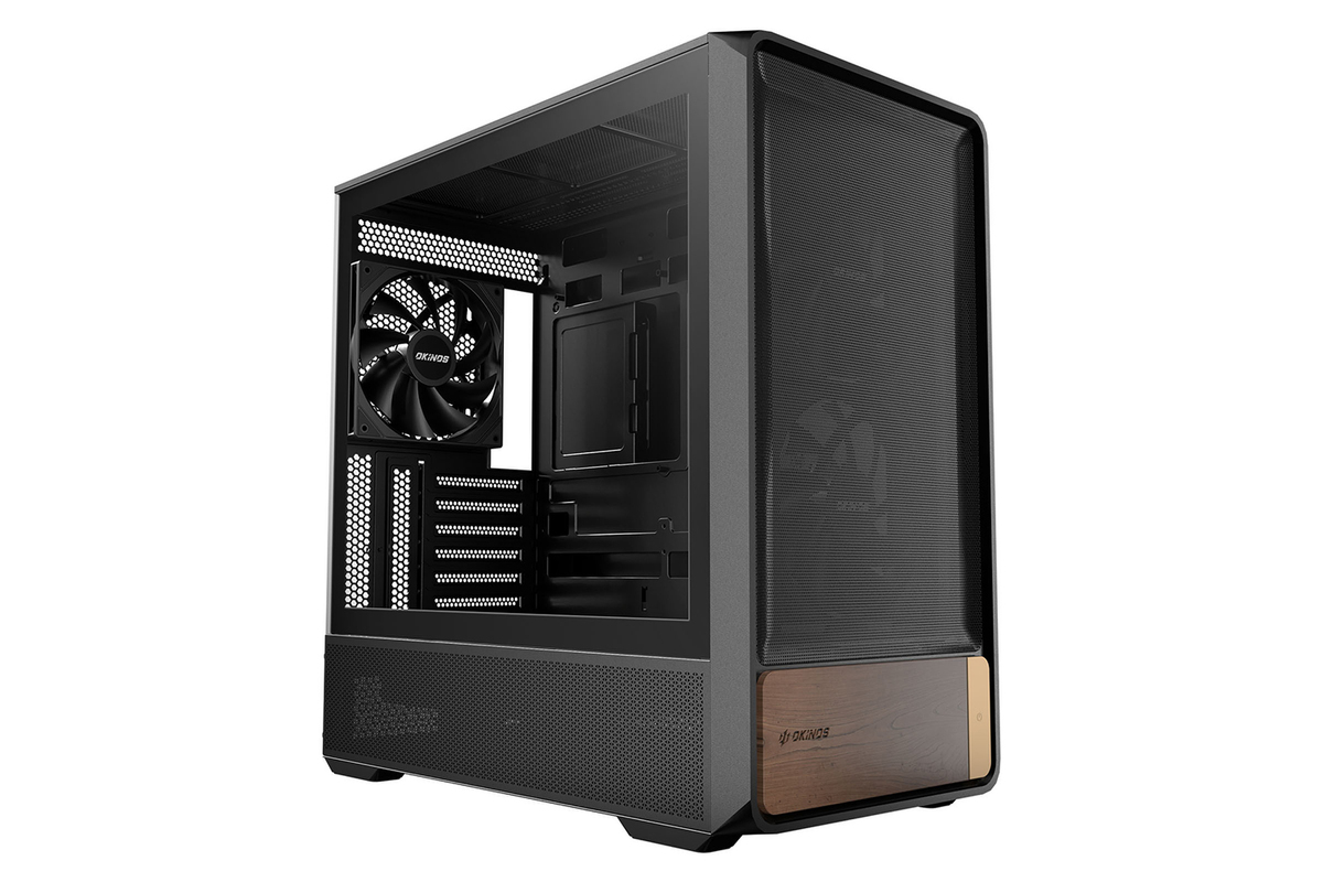 毎日のように目にするPCケースには、ミドルタワーPCケースのOkinos「Air Cross」を選んでいる。フロント下部には本物のウォルナット材を使用し、温かみのある外観となっている。
