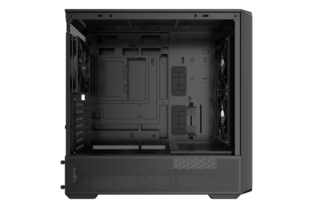 フロントやボトムパネルがメッシュ仕様になっており、良好な通気性能を実現している。ケースファンは豊富で、フロントに2基の140mm、ボトムに2基の120mm、リアに1基の140mmファンを標準装備している。追加投資不要で、強力な吸排気が可能となっている。