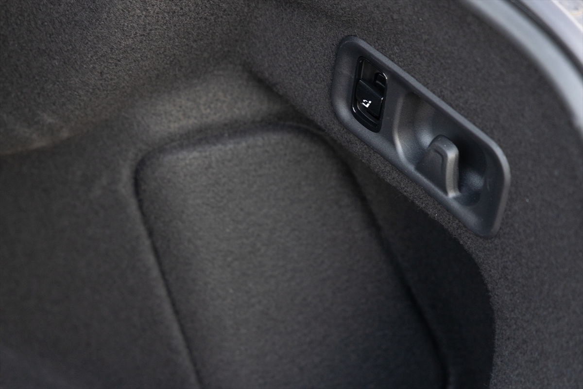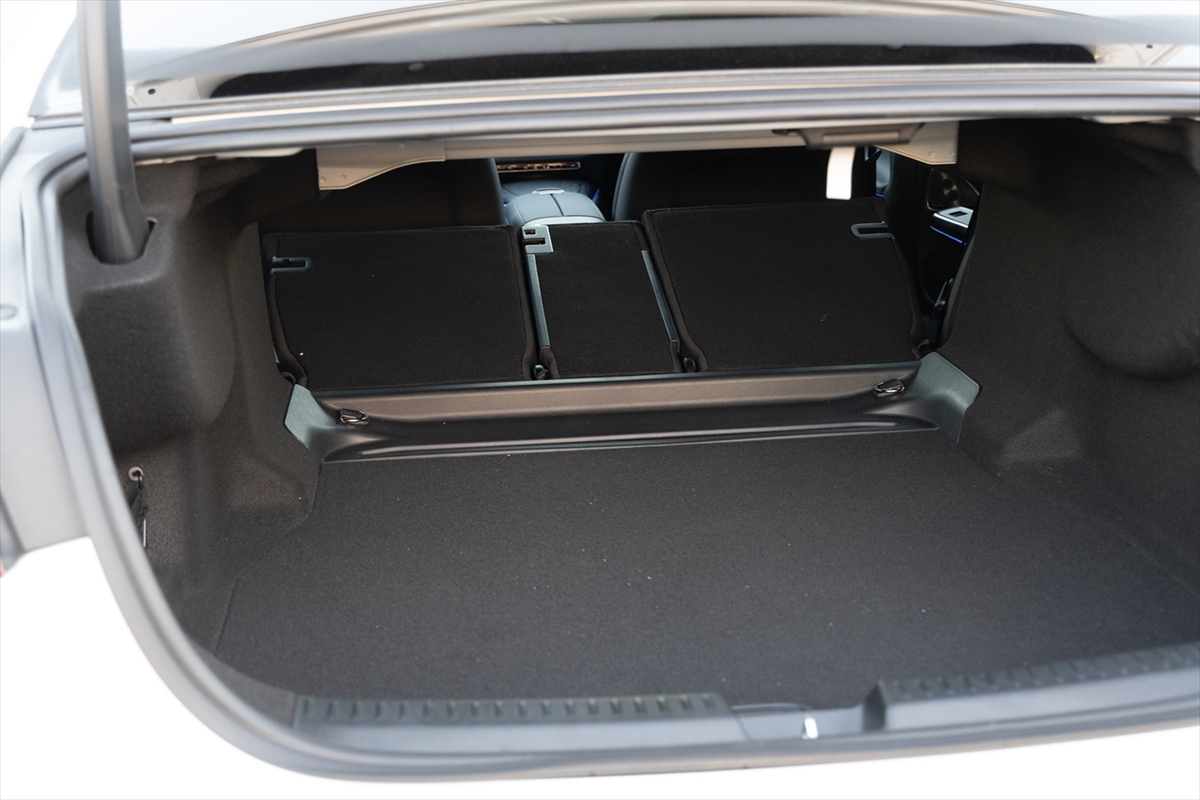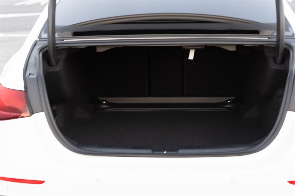 セダンなのでトランクリッドの開口部はそれほど広くはありません。驚いたのは電動開閉式で、動きは実にスムーズ。奥行きはかなりあり、容量は540LとミドルクラスのSUV並み。あると便利な12Vアクセサリーソケットの姿は見えませんでしたが、荷室側から簡単に後席が倒せるのは◎。後席を倒してみたところ、少し段差はありましたが、大型の荷物を積載するに十分すぎる容量です。