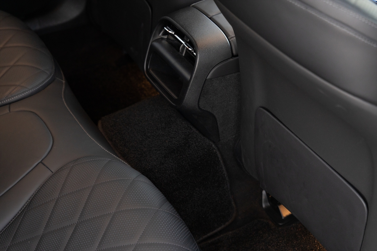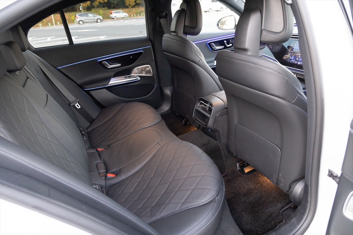 Eクラスはドイツ国内ではタクシーとしても使われているとか。それもあってか、後席はかなり広く、そして上質な空間です。USBはType-Cが2系統と十分実用的。センタートンネルが大きいのは、FRレイアウトゆえにドライブシャフトが通っているからでしょう。