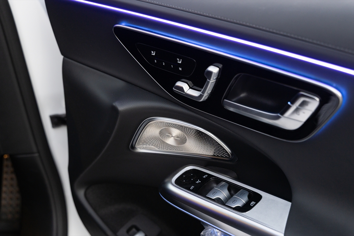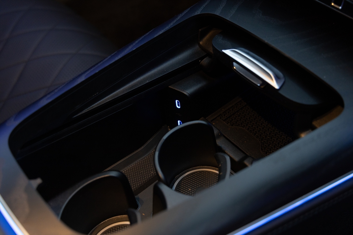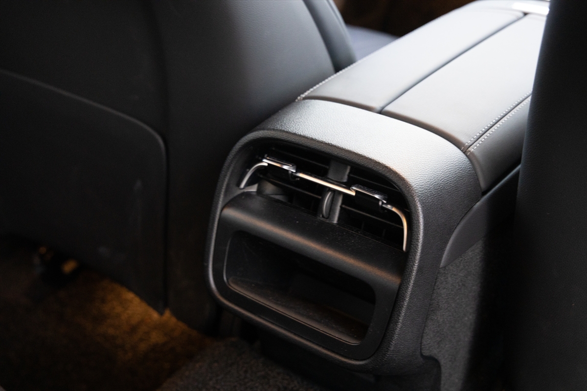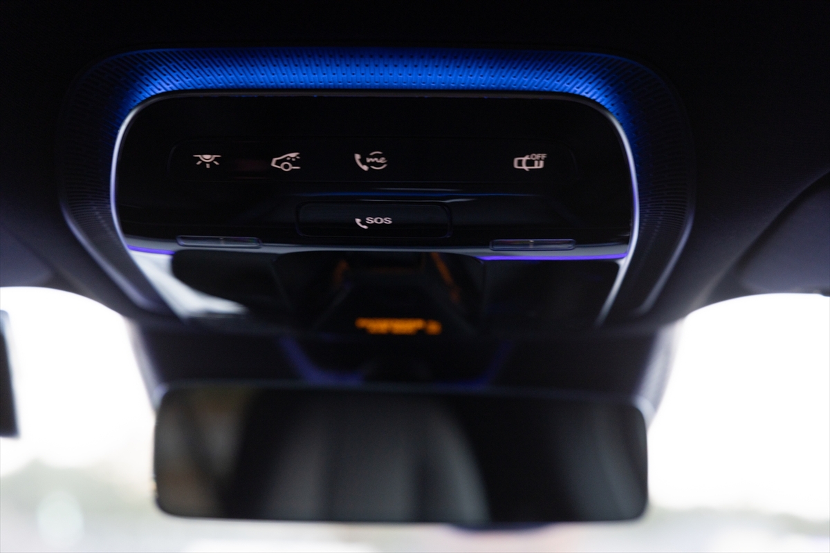 ドアにはシートヒーターとベンチレーションのボタンを配置。センターコンソールのボタンは少なく、基本的な操作はタッチスクリーンに委ねられています。ドリンクホルダーは2つで、USB Type-Cはセンターコンソールに1系統、アームレスト内に2系統用意されています。天井にはSOSボタンがありました。日本車では見かけるSOSボタンですが、輸入車ではそう多くはありません。