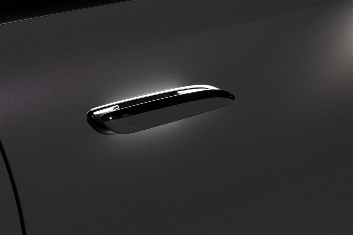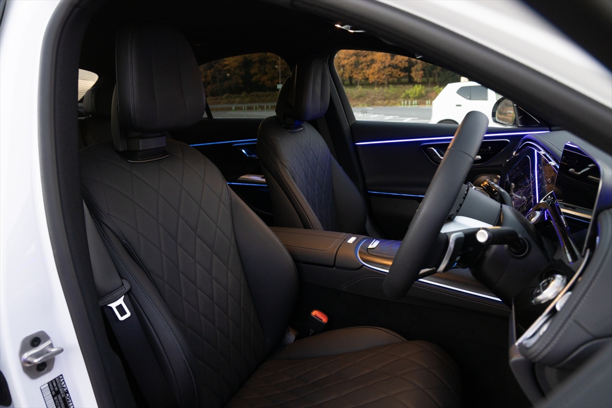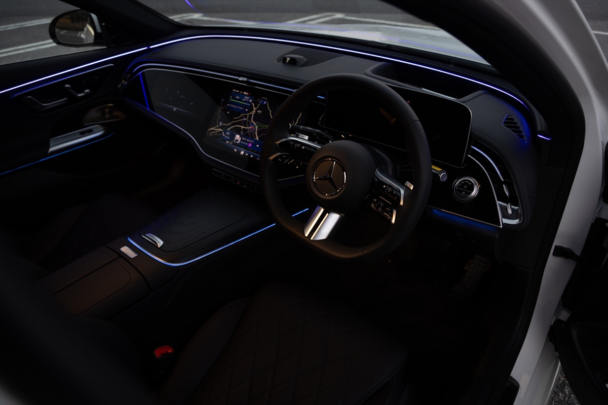 メルセデスの室内といえばイルミネーション。一時期はギラギラしていましたが、Eクラスは少し大人しくなったような気がします。ミラー下あたりにパターンプロジェクターが用意され、スリーポインテッドスターがお出迎え。ドアも光り、スペシャル感がアリアリです。