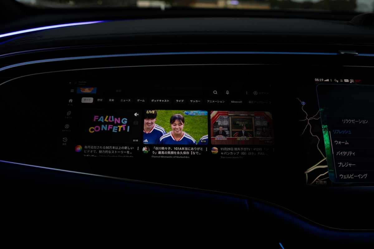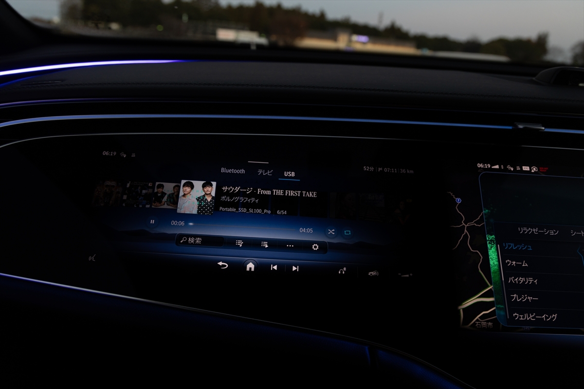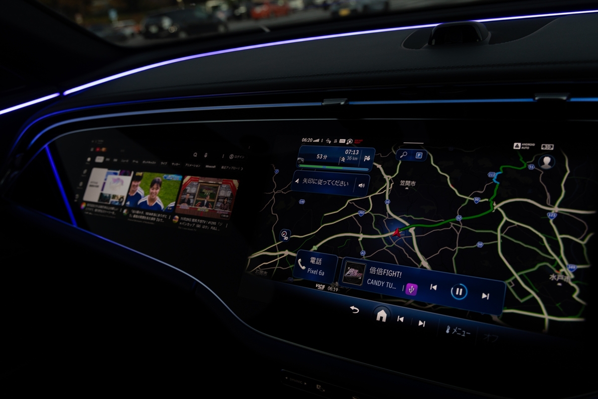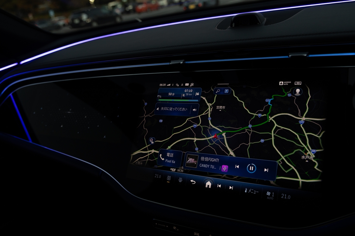 運転席は水平基調のデザインで、広がり感があり◎。メルセデスとしては珍しくインフォテインメントのモニターが横置きに配置されていて、助手席にもモニターがあります。なお、アクセルペダルは伝統のオルガン式です。