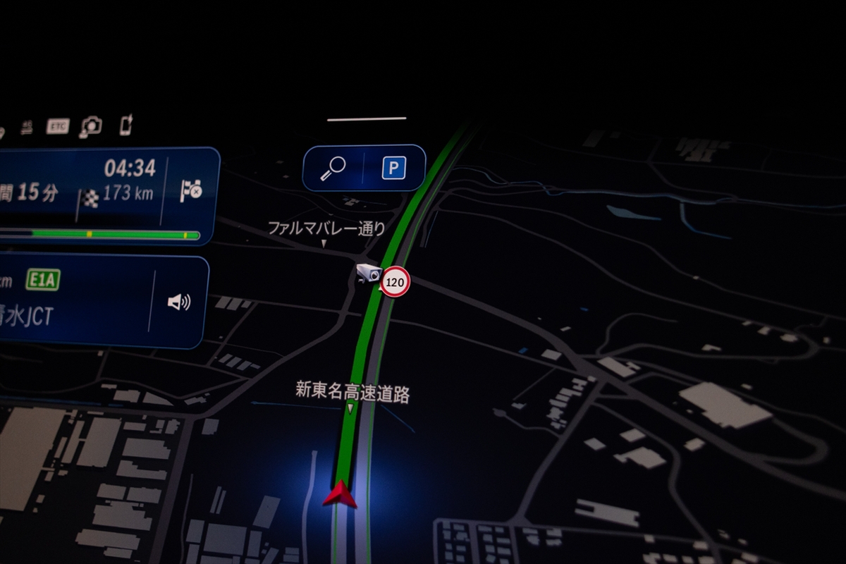 クルーズコントロールを100km/hにセットし、あとはハンドルを握るだけ。驚いたのは地図に厚木ICと泰野中井ICの間にある44kmポスト付近の伊勢原オービス(Hシステム)が表示されたこと。100km/hで走っているので問題はありませんが。