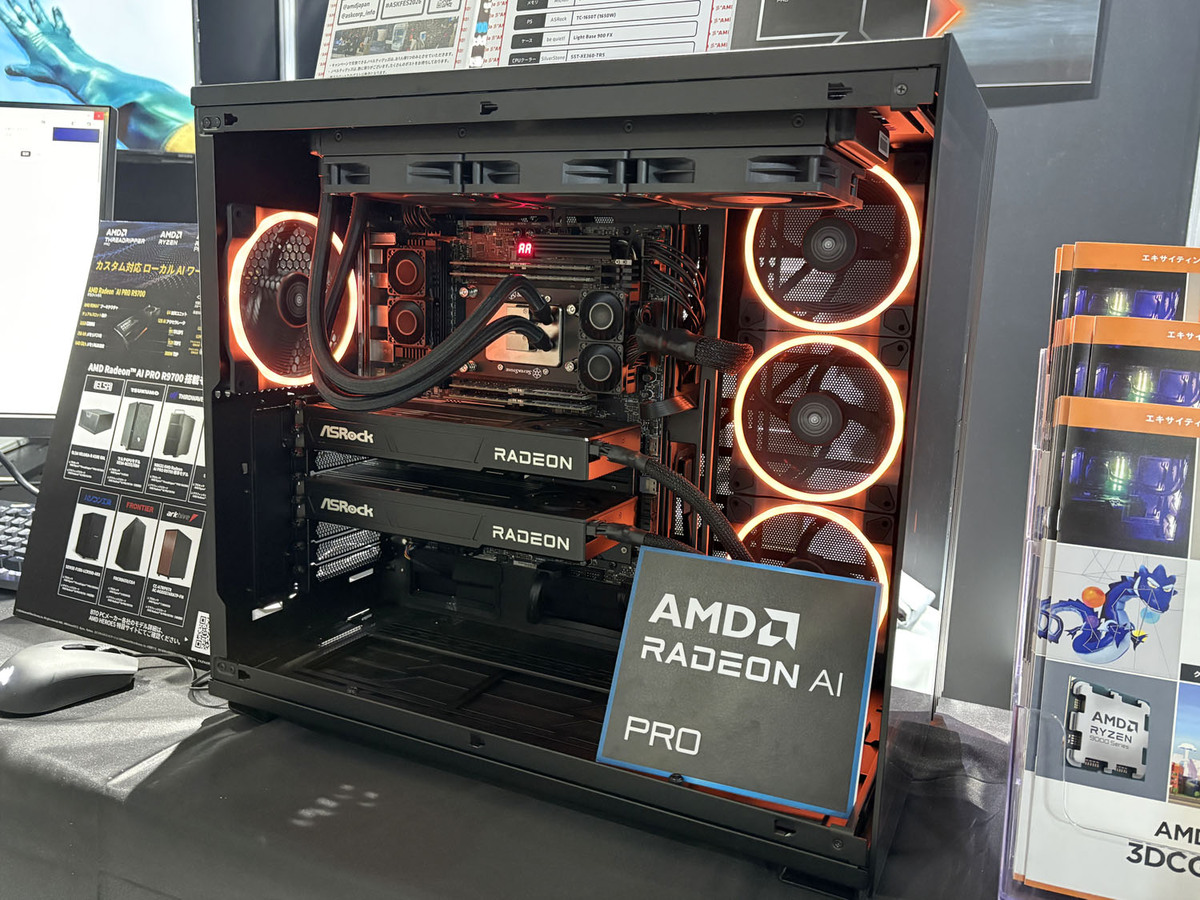 Radeon AI PRO R9700を2枚搭載したカスタム対応ローカルAIワークステーションを展示。DaVinci ResolveベンチマークのOverall Scoreで15062.00という数値を叩き出していた