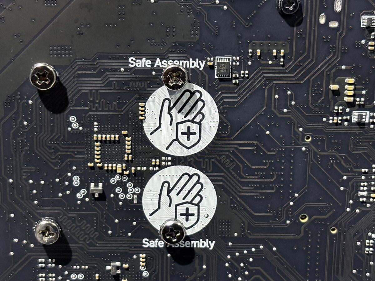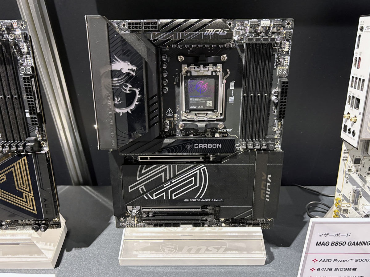 近日発売予定のマザーボード「MPG X870E CARBON MAX WIFI」。基板背面のピンをフラットな形状に再設計し、組み立て時に鋭利な半田の突起で指を怪我するリスクを低減している