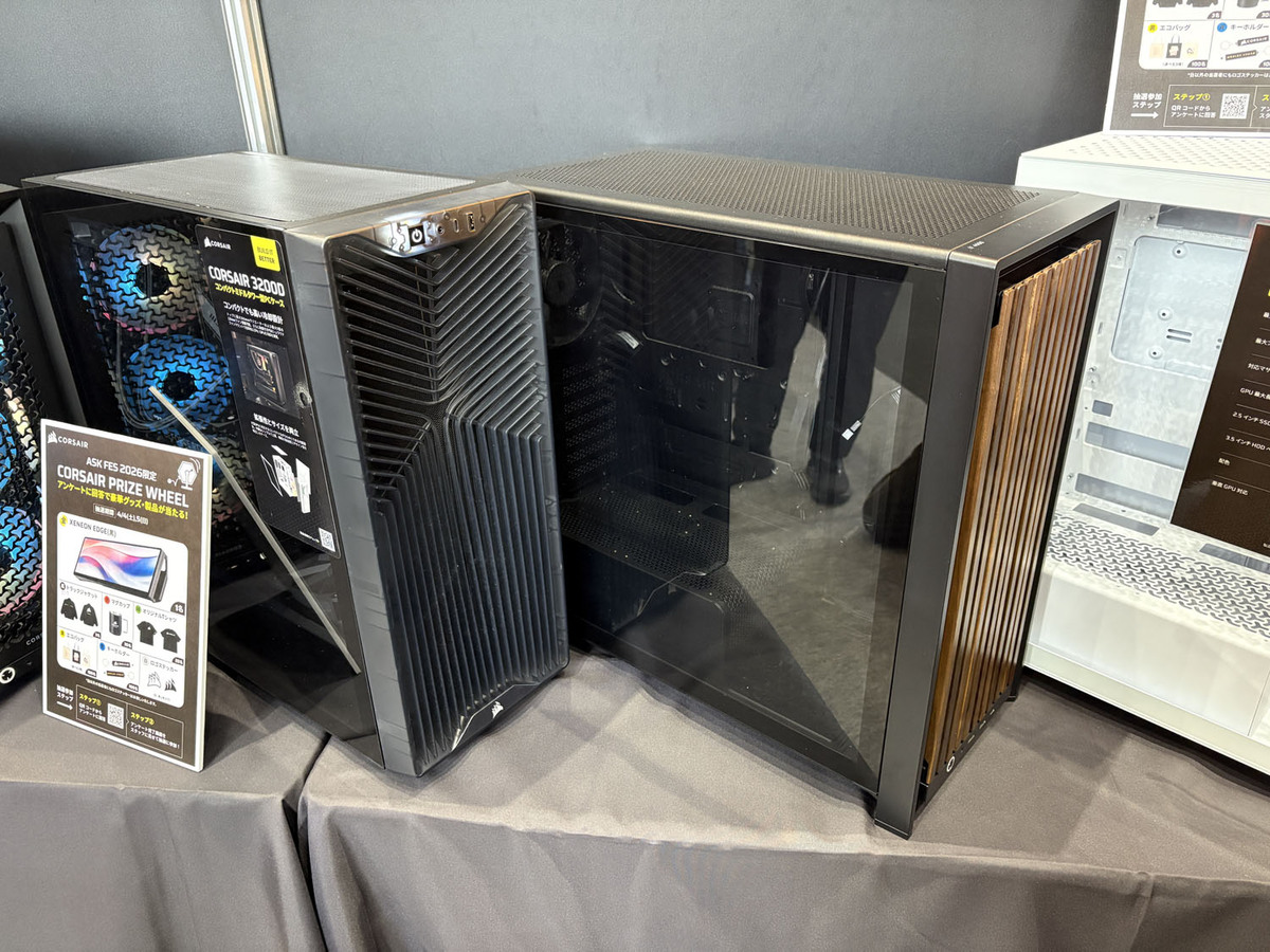 近日発売予定のPCケースCORSAIR 3200D(左)とCORSAIR 4000のウッドパネルモデル(右)を展示