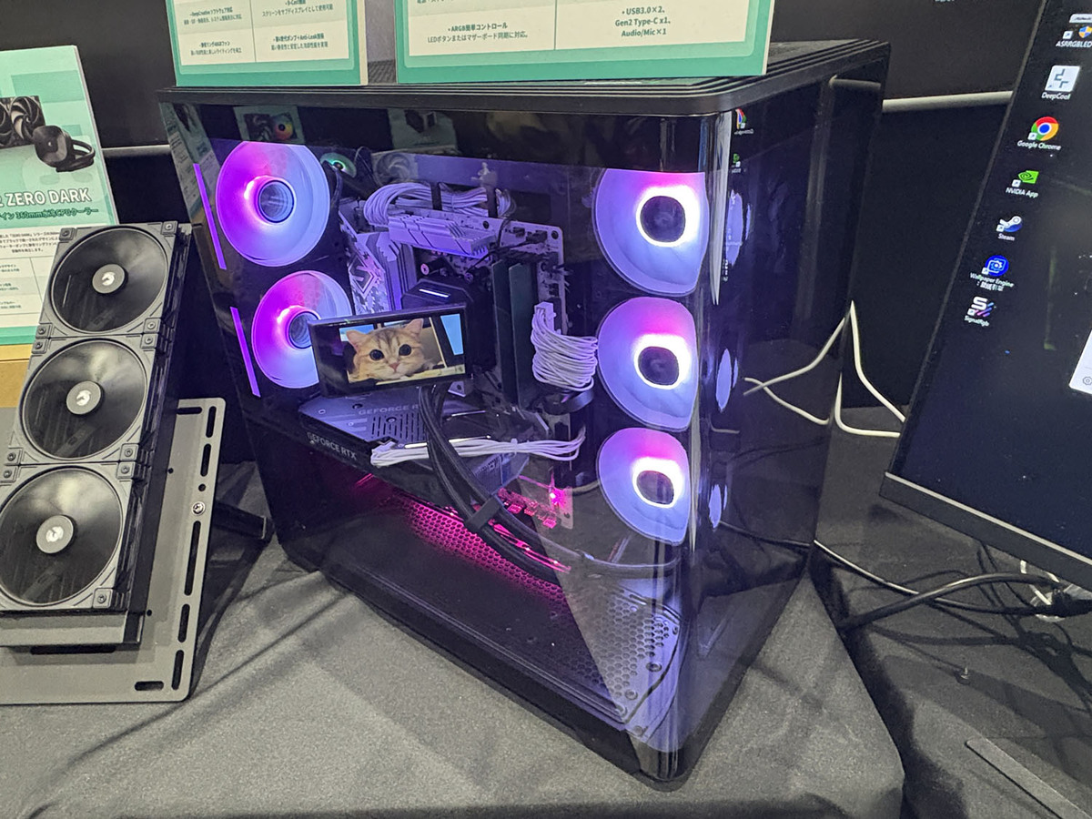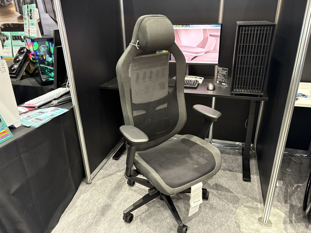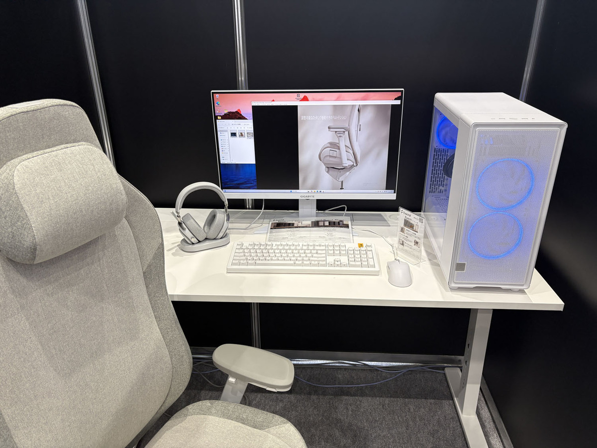 ゲーミングチェアとヘッドセットとPCケースを展示。会場でアンケートに答えるとゲーミングチェアFractal Refine Fabric Lightが当たるプレゼントキャンペーンを実施中
